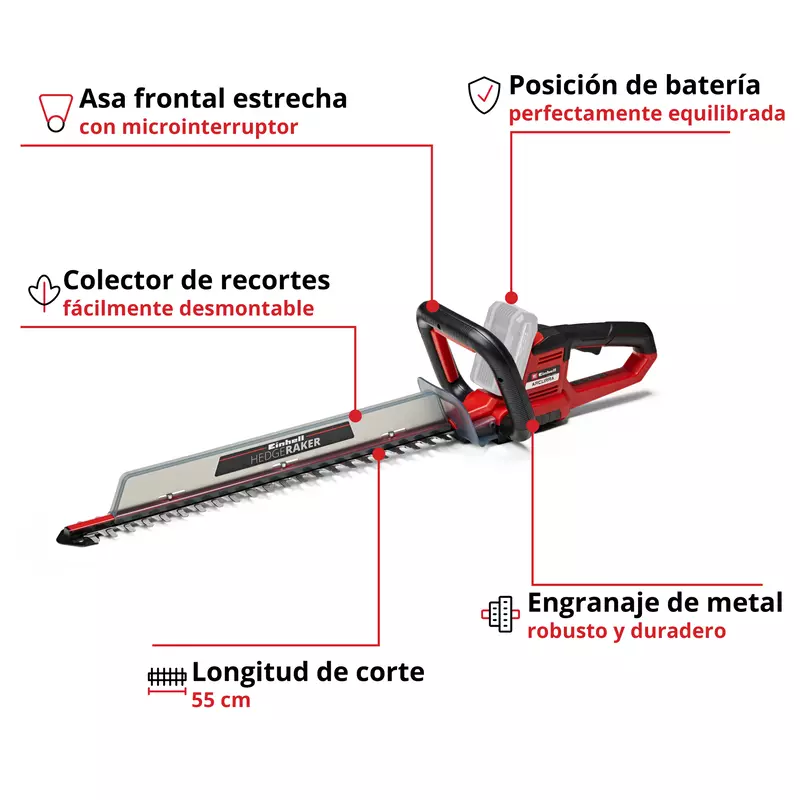 El cortasetos inalámbrico Einhell ARCURRA 18/55 es un potente miembro de la familia Power X-Change de Einhell. La innovadora serie PXC sobresale por su gran potencia y máxima flexibilidad: Las baterías de iones de litio se pueden intercambiar entre los equipos de esta serie de Einhell. Las cuchillas del cortasetos ARCURRA están hechas de acero cortadas con láser, afiladas con diamante, diseñadas para ofrecer la máxima precisión y duración y con las que el cortasetos inalámbrico logra una longitud de corte de 55 centímetros y hasta 2400 cortes por minuto. La empuñadura ergonómica y fina del cortasetos ARCURRA 18/55 está equipada con un microinterruptor. El resistente engranaje metálico garantiza una vida útil prolongada del cortasetos inalámbrico. Después de cortar el seto, el material cortado se puede retirar perfectamente de la parte superior del seto gracias al práctico recolector. La cubierta de aluminio protege las cuchillas y su resistente soporte las protege durante el almacenamiento y también ayuda a que el transporte sea seguro. En el envío se incluye un protector contra impactos con un soporte para montaje en la pared. El envío no incluye batería ni cargador. Estos se pueden adquirir por separado, en forma de un práctico set de inicio. El cortasetos inalámbrico Einhell ARCURRA 18/55 precisa una batería Power-Change de 18 voltios para funcionar.