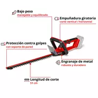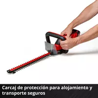 El recortasetos con batería GC-CH 18/50 Li Solo de Einhell reúne potencia y flexibilidad: Como miembro de la familia Power X-Change de Einhell, el recortasetos se acciona por una de las potentes baterías de iones de litio de la serie. El recortasetos pequeño y manejable es un verdadero «peso ligero» y cómodo en el manejo debido al bajo peso. Gracias a la empuñadura trasera giratoria y de la gran asa frontal puede realizarse también cortes de setos amplios y que requieren tiempo con poca fatiga. El robusto engranaje metálico está diseñado para una larga duración y aporta la perfecta conversión de la potencia de batería en la cuchilla de acero cortada por láser, afilada por diamante. Un interruptor de seguridad a 2 manos protege al usuario durante el funcionamiento. El alcance del envío contiene una cubierta de cuchilla de aluminio para proteger la cuchilla y una protección contra choques con soporte para montaje en pared y un estable carcaj para almacenamiento y transporte. Las baterías de la serie Power X-Change de alta calidad pueden combinarse sin límites con todos los equipos del sistema. Para el funcionamiento del recortasetos con batería es necesaria una batería PXC de 18 V. El envío se realiza sin batería ni cargador, estos son adquiribles por separado, por ejemplo, como un práctico set para principiantes.